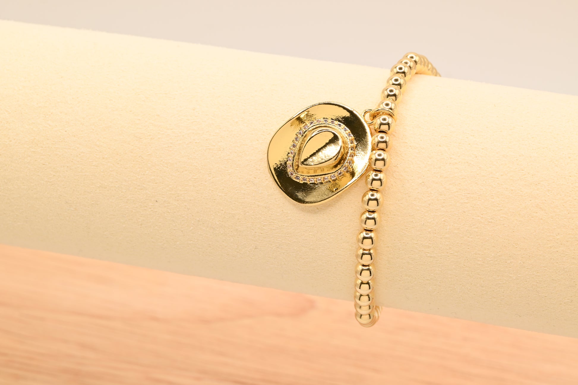 Introducing our "Golden Cowgirl Charm Bracelet" – a stunning piece that perfectly marries elegance with western flair. This bracelet features a strand of lustrous gold filled beads, finished with a striking gold cowgirl hat charm. Ideal for adding a touch of rustic glamour to any outfit, this unique accessory is perfect for those who love to blend classic style with a hint of country charm.
