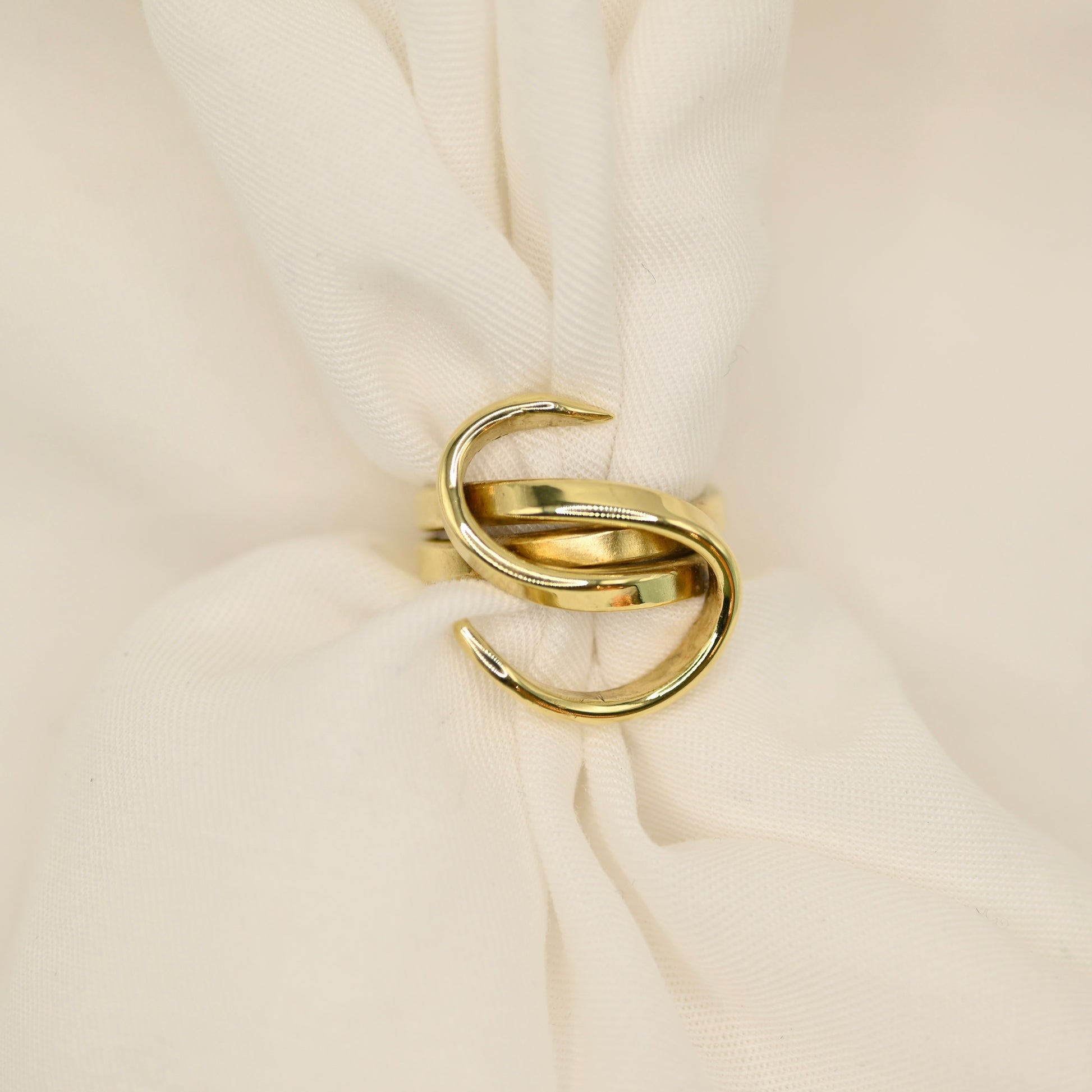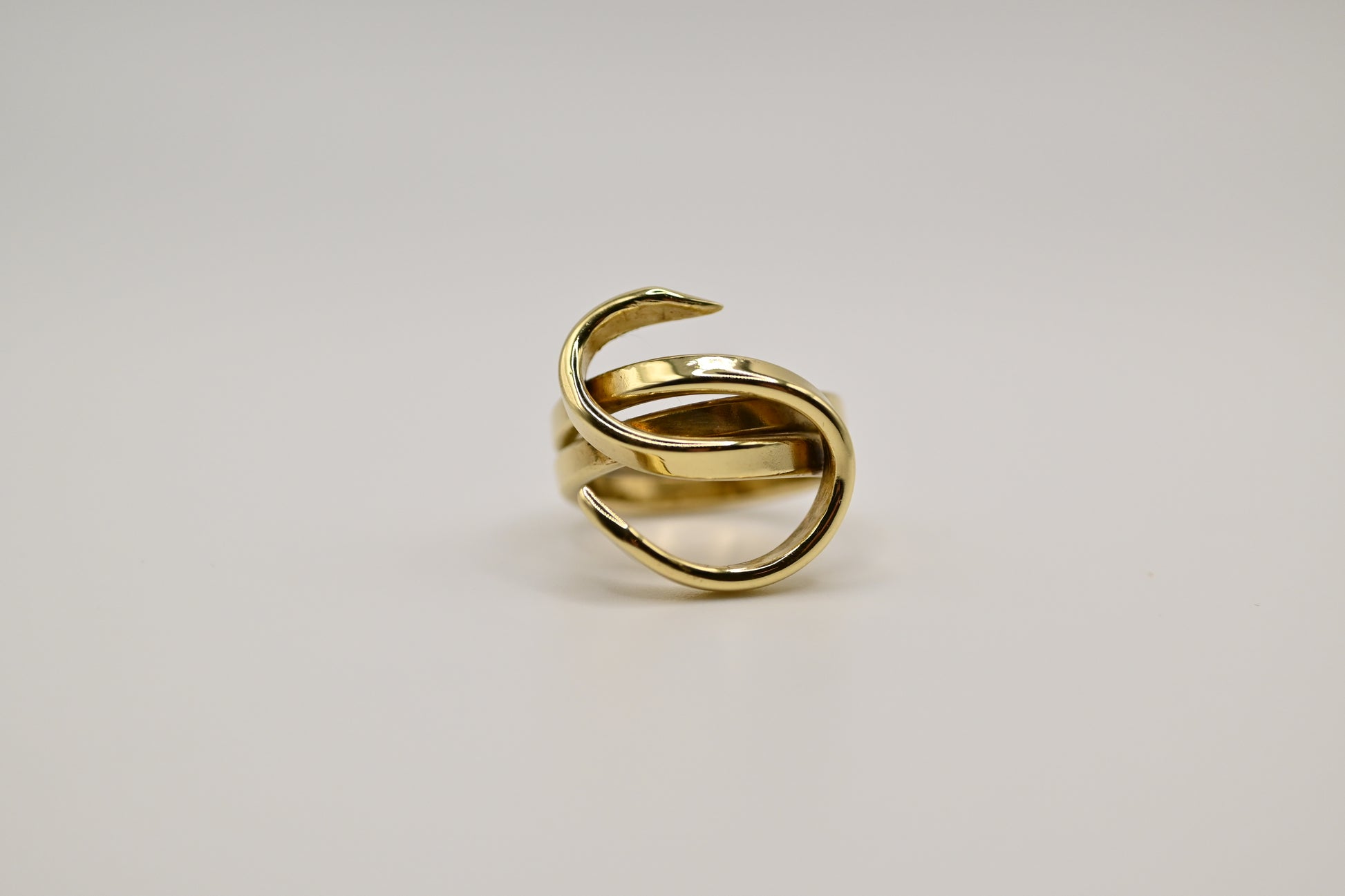 Introducing the "Golden Swirl" – a stunning, brass ring that boasts a unique, twisty S-shaped design. Crafted by hand, this elegant piece is perfect for adding a touch of sophistication to any outfit.