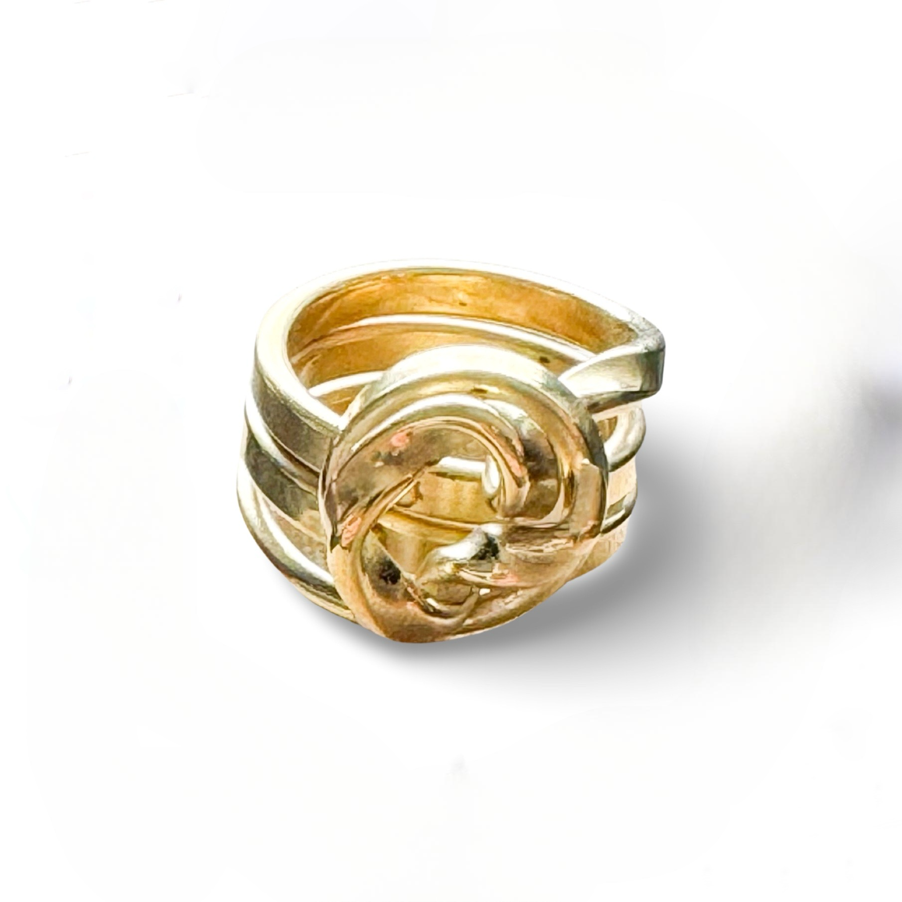 Think of these rings as wearable art. To create one, I form a brass metal band into multiple free-form circles. Each ring is made by hand.