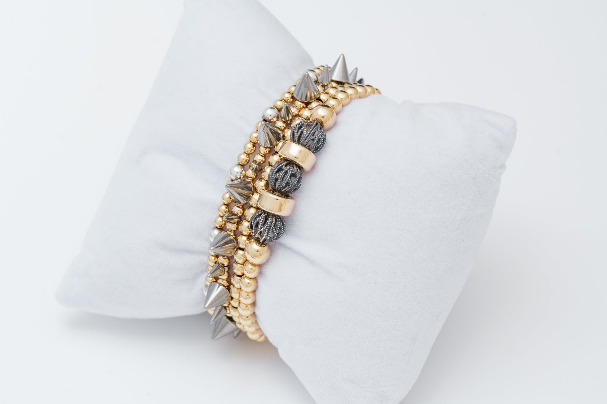 Bracelets are made from 14K gold filled beads and sterling silver beads. They are non-tarnish and water resistant. They are hand strung on elastic cord.